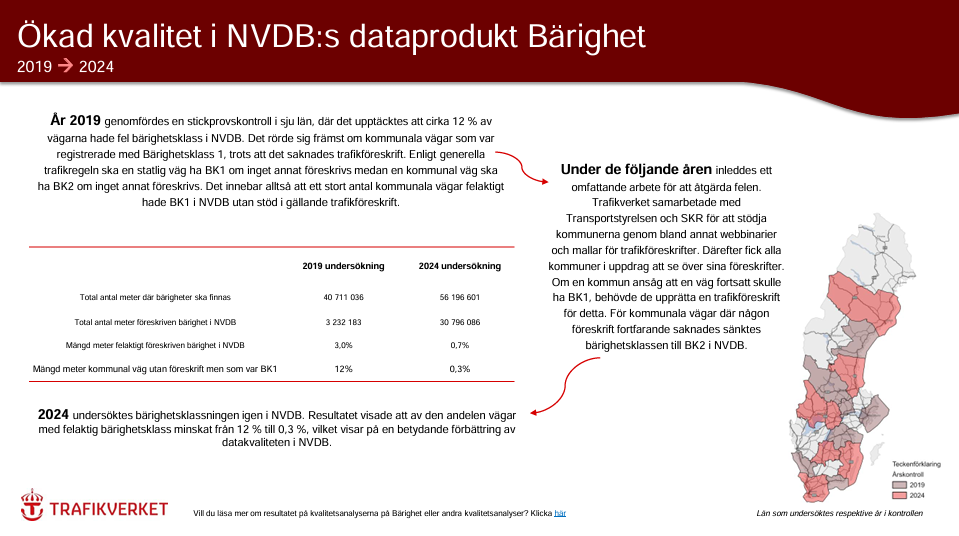För Bärighet kan ni även läsa om hur kvaliteten har förbättrats i NVDB från 2019 till 2024 i en onepage, som ni kan läsa här.